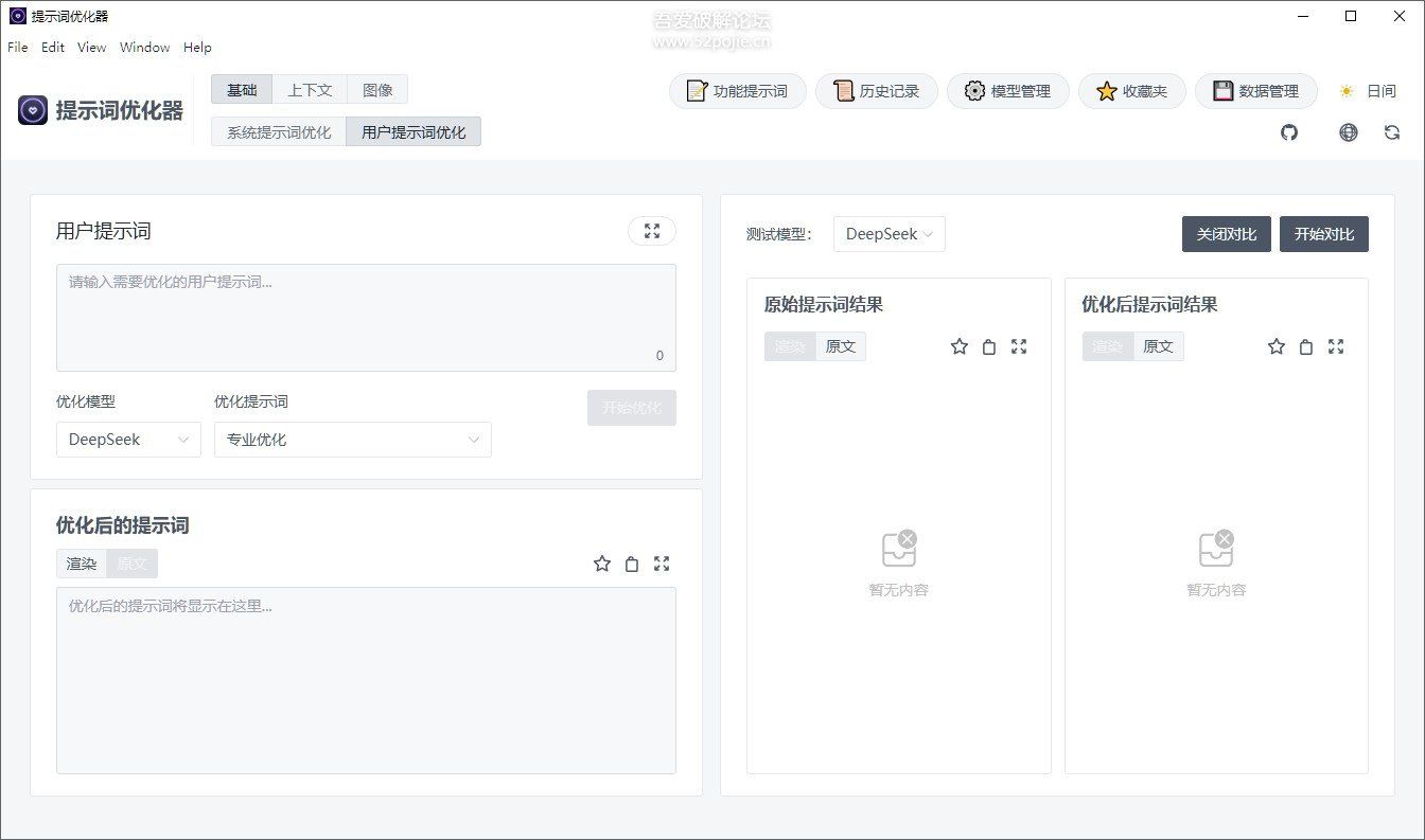 - 智能提示词优化:支持系统提示词和用户提示词双模式优化,实时对比优化效果
